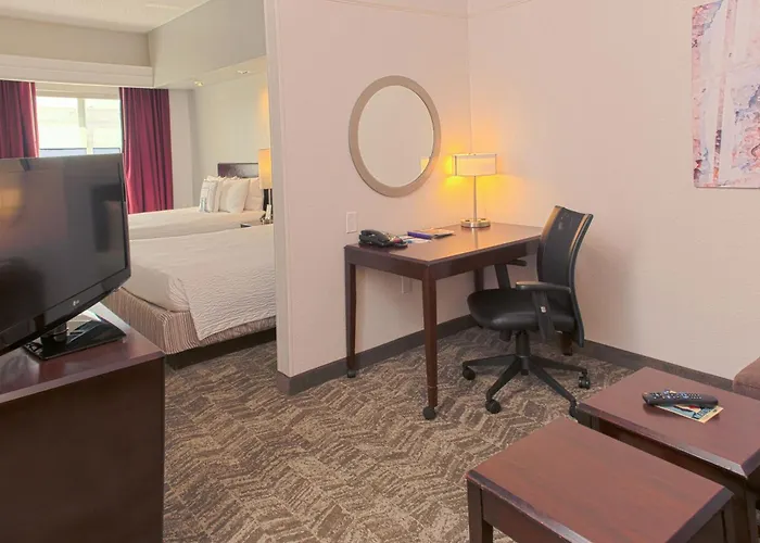 **Accommodations at SpringHill Suites** comprise 91 thoughtfully designed suites that ensure a restful stay. Each room is equipped with essential amenities, including air conditioning, wet bars, MP3 docking stations, and flat-screen televisions with cable programming. Guests can unwind in separate sitting areas or complete work tasks at the laptop-friendly workspaces. Private bathrooms feature shower/tub combinations stocked with complimentary toiletries, ensuring a refreshing experience with every stay.